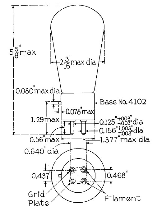 Only a few DHTs have amplification factors which make them suitable to get significant gain. Most of the higher mu ones with an amplification factor in the two digit range have very high plate resistances which limit their usability. The 841 is basically a modified 801 with the grid spacing altered to increase the amplification factor. Dispite it's high mu it has a still moderately low plate resistance of 40 kOhm. Too high for transformer coupling, but perfectly usable with RC coupling. Even LC coupling seems feasable with a suitable plate choke. The 841 has the same UX4 base and pinout as most DHTs. The base connections are pictured on the left. The complete RCA datasheet can be found